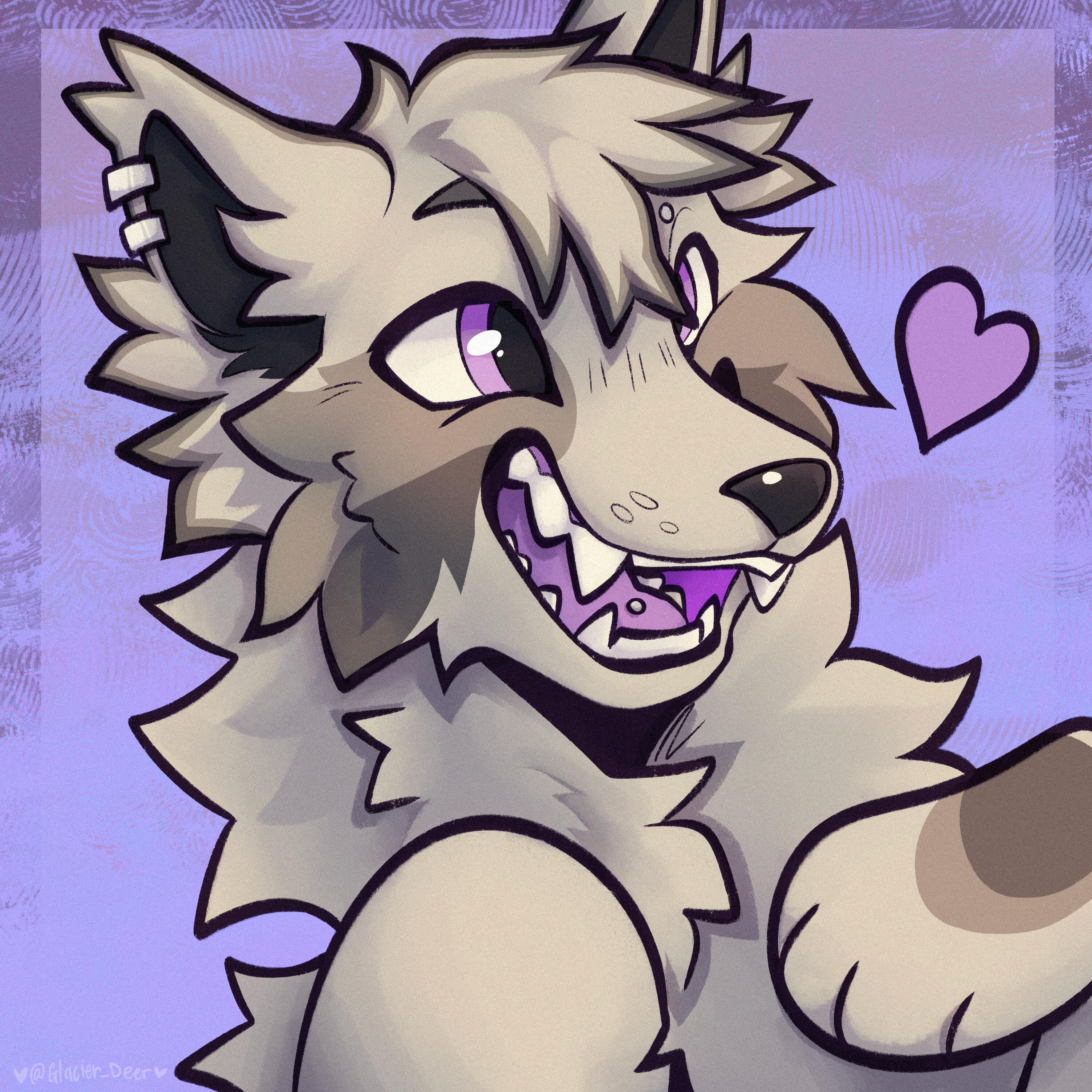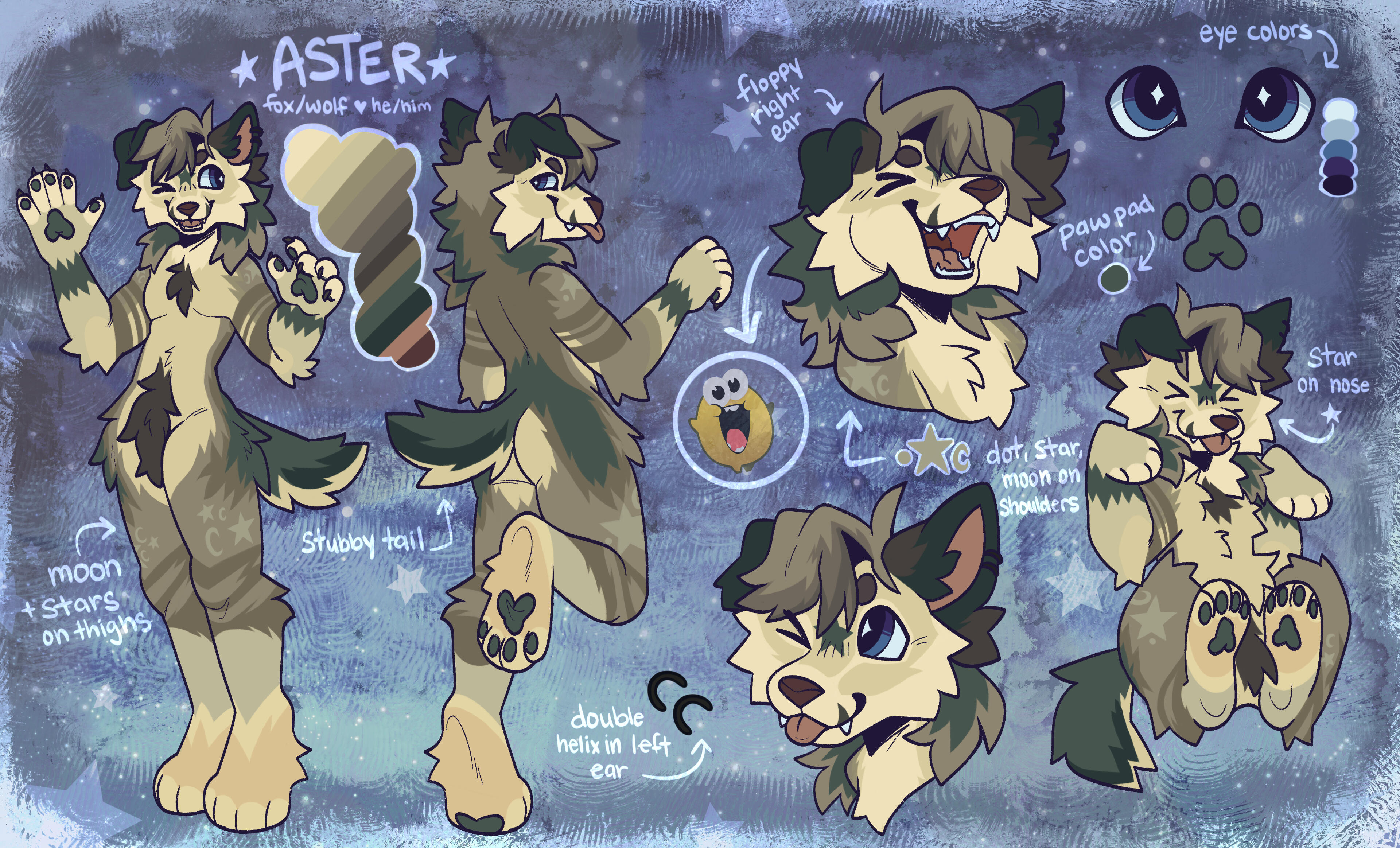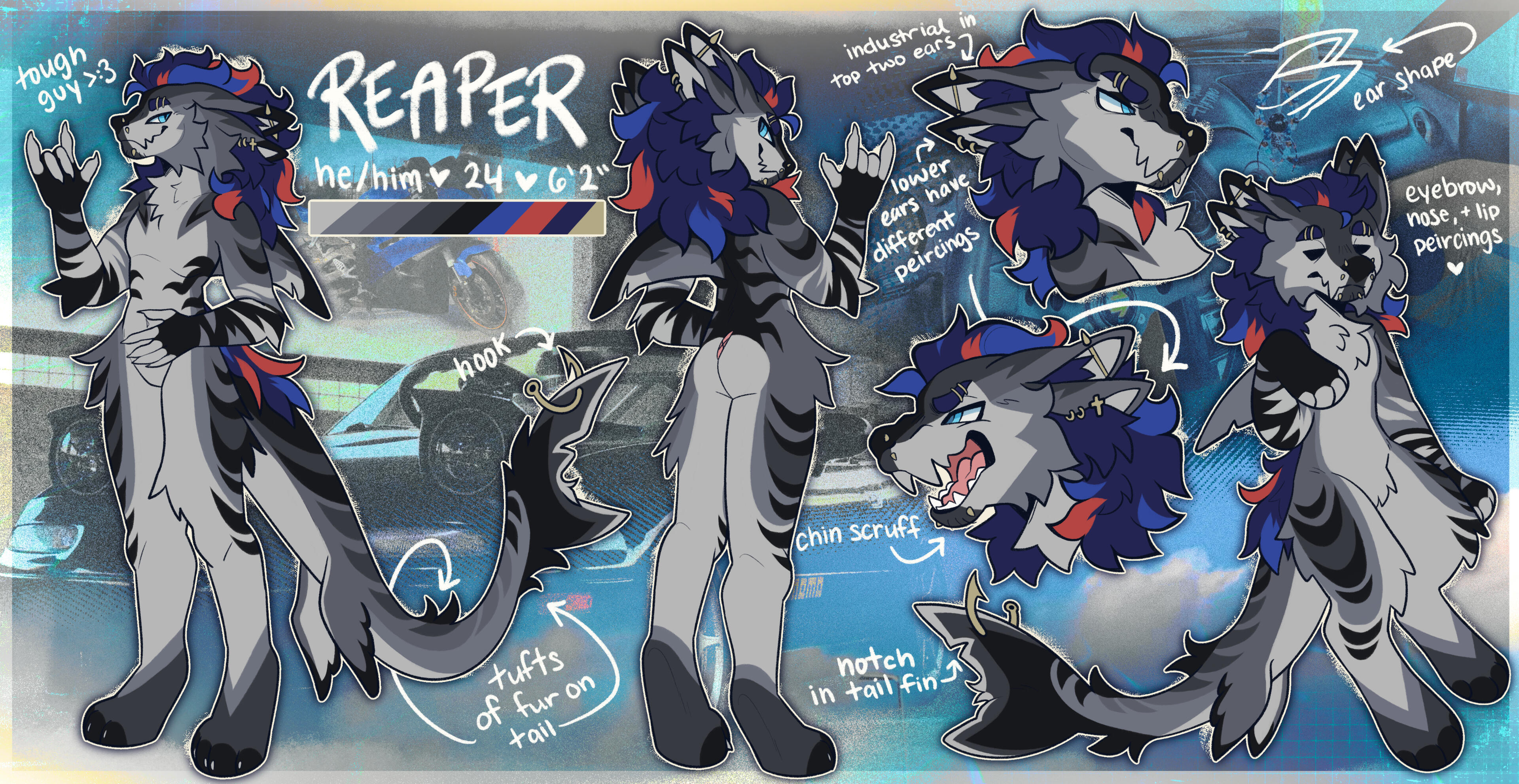 my fully custom refs include: two fullbody views of your character, one chibi, two headshots, one accessory/body part view, a personalized background, and character info. (i do not charge for basic things like flavor text, simple views of eyes/tongue/nose, or pawpads.